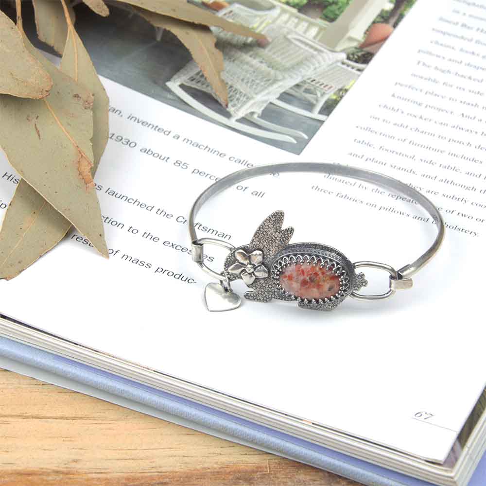Indulge with my playful handmade Bunny Rabbit Bangle. Adorned with a natural Red Jasper gemstone, known for its balance and protection, each piece is uniquely crafted using traditional methods and sustainable 925 Sterling Silver. Treat yourself or someone special to this one-of-a-kind artisan jewellery piece.