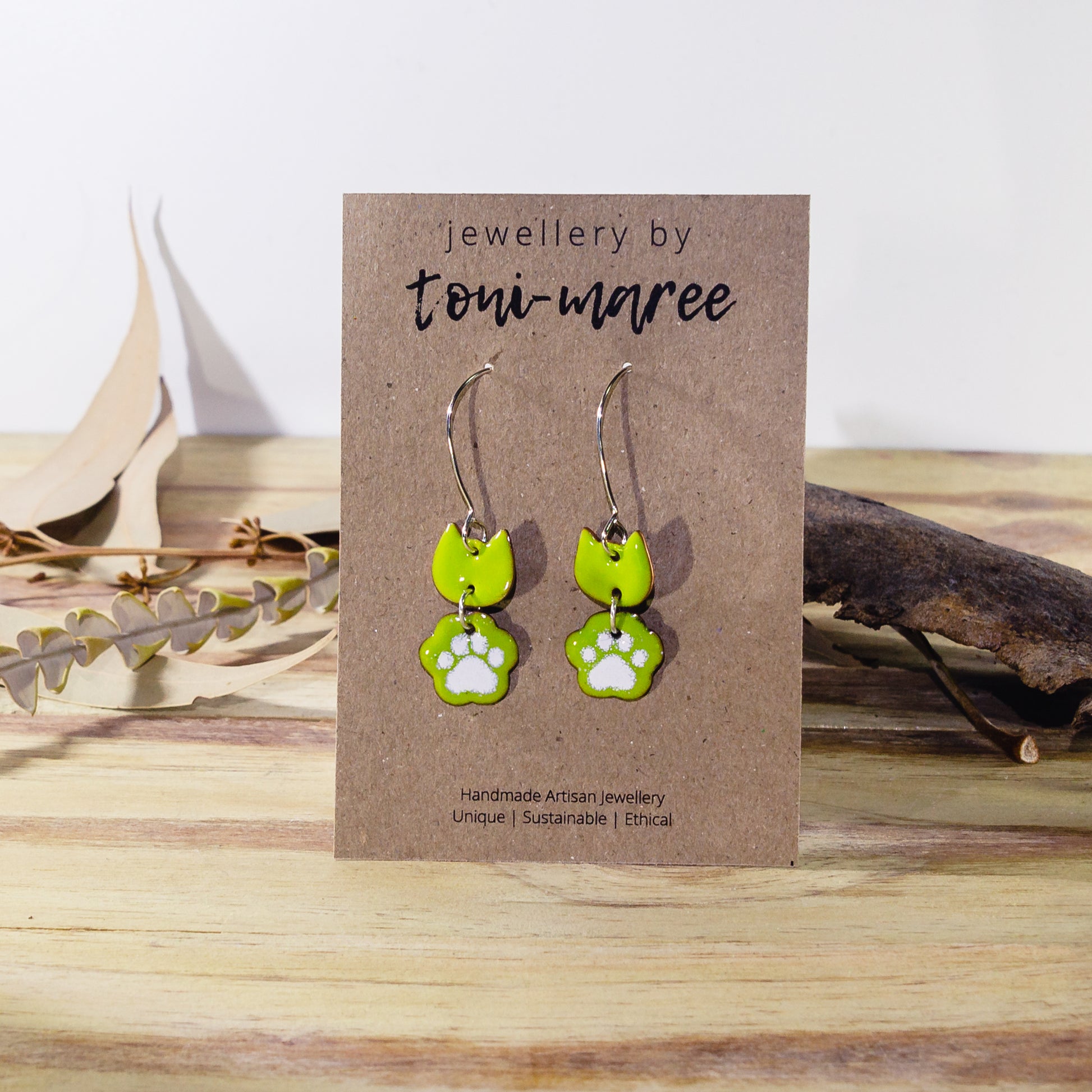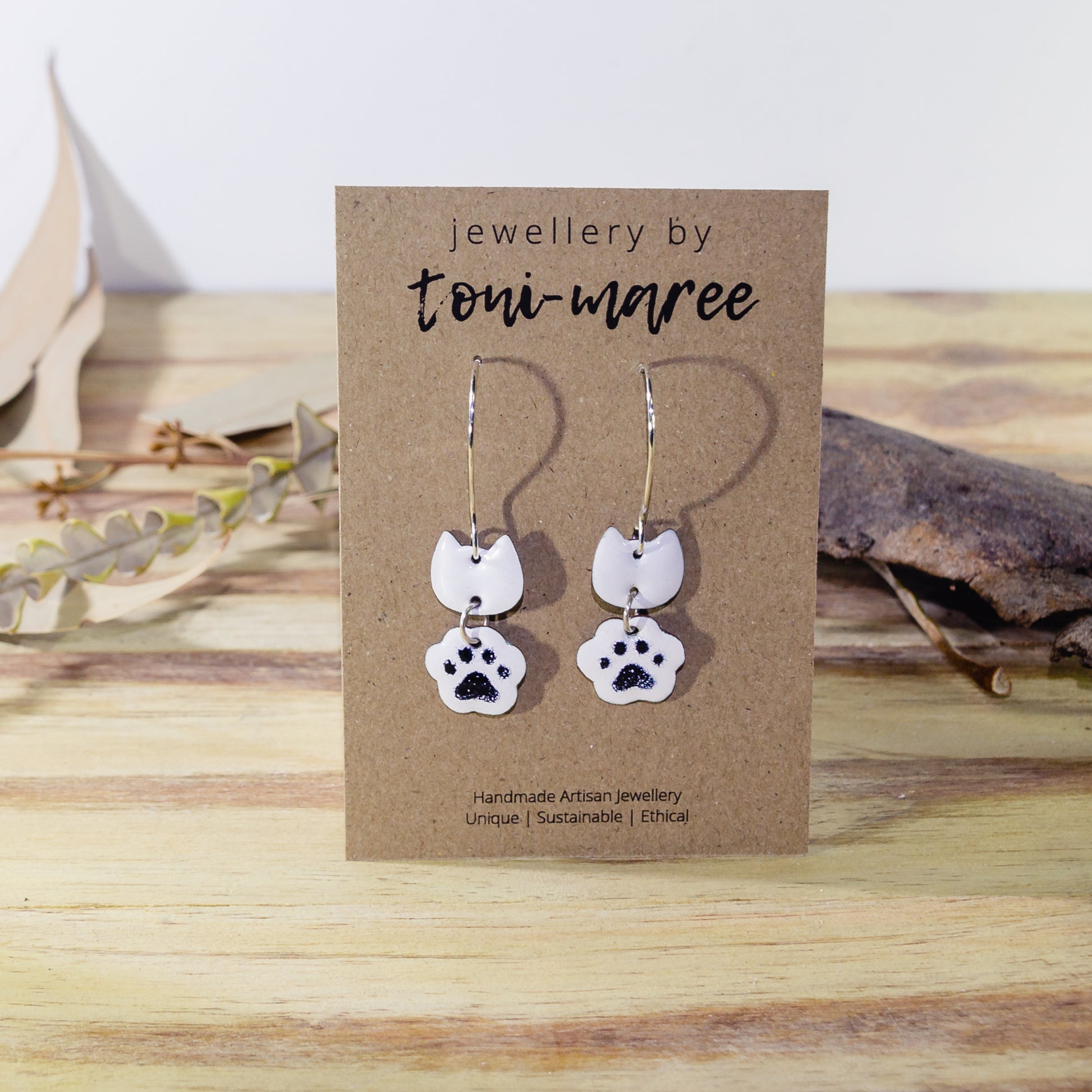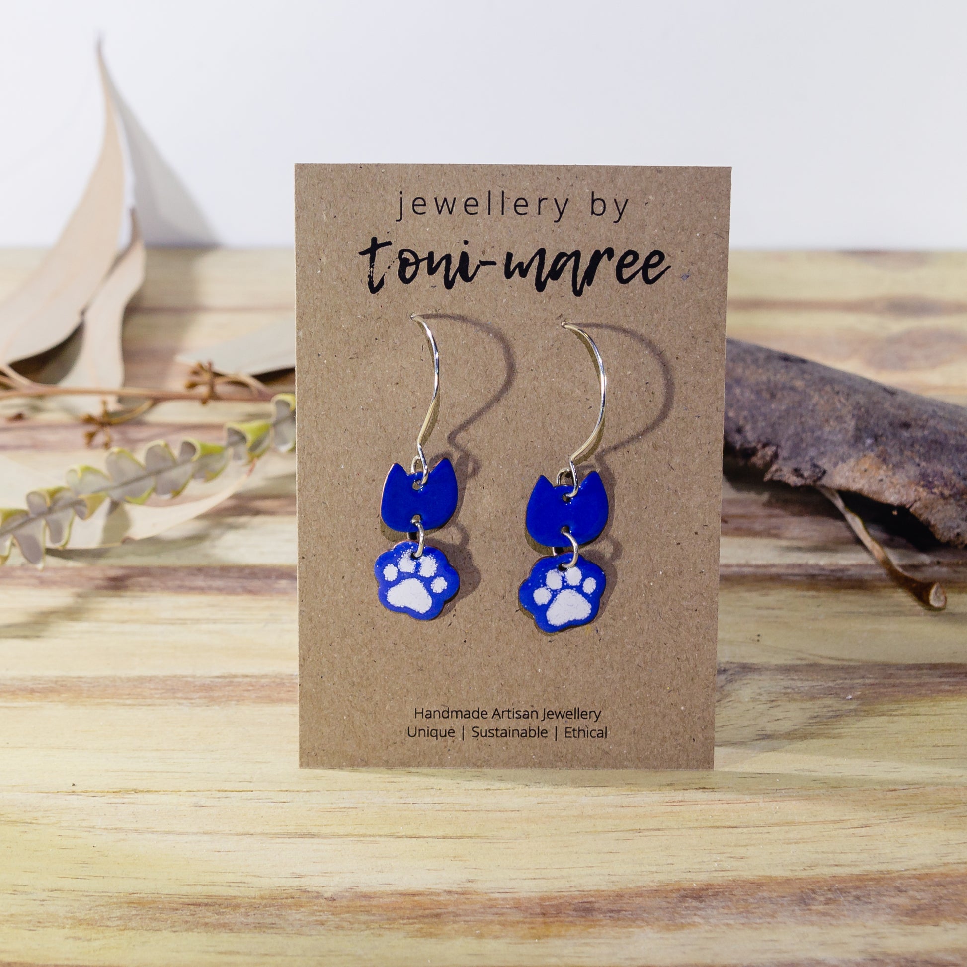 These Kitty Paw drop earrings are adorable and make for the purrfect accessory for all the cat lovers out there! The earrings showcase glossy vitreous enamel cat head silhouettes with stencilled paws. Additionally, all earrings come with glossy blue-black enamel backs and 925 Sterling silver ear wires that are safe for sensitive ears. These earrings make for a beautiful gift or a great addition to your jewellery collection.