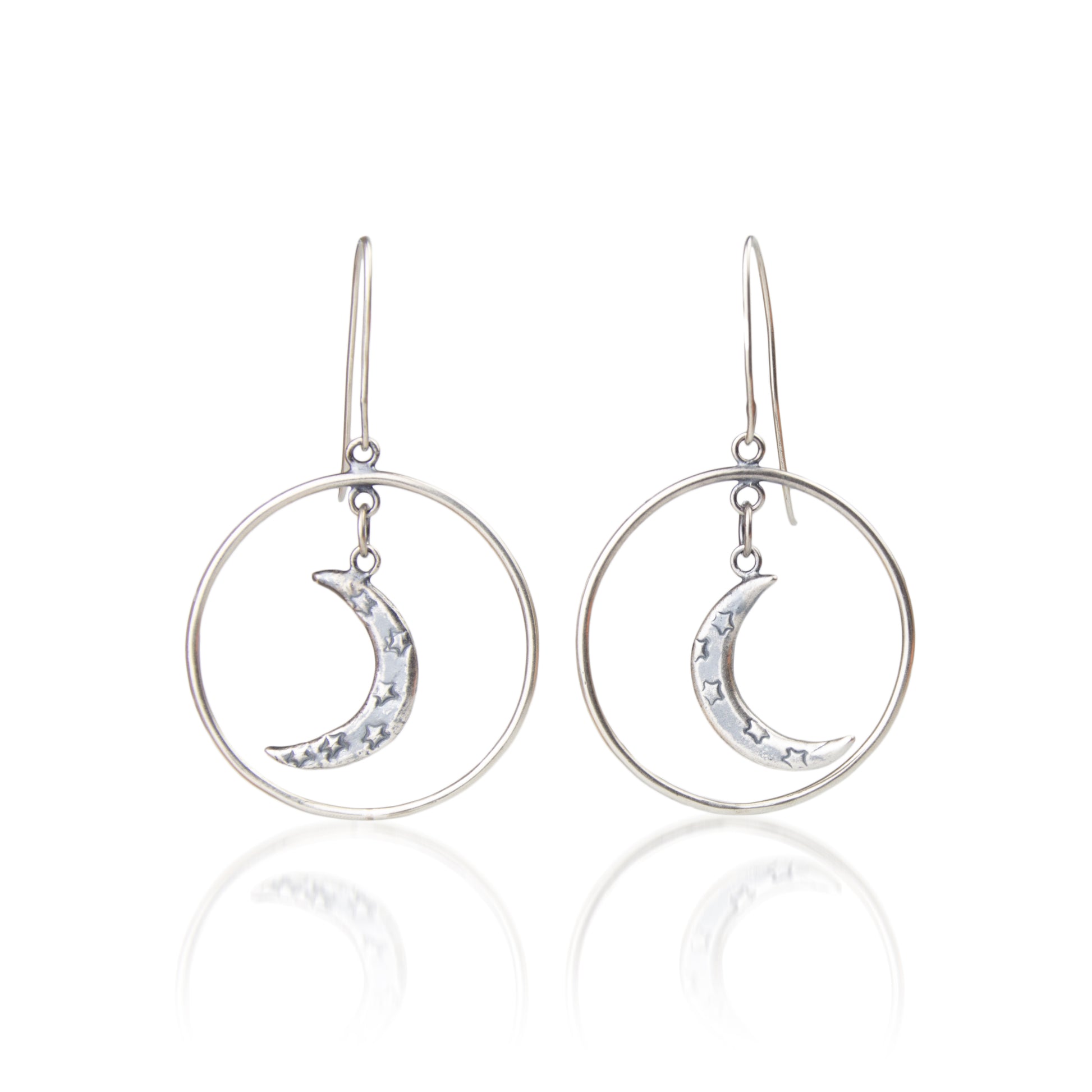 The moon, a symbol of serenity and femininity, is handmade, ensuring that each piece is not just an accessory but a work of art. The Sterling silver circles add a touch of timeless elegance, their lustrous sheen complementing the intricate moon design.