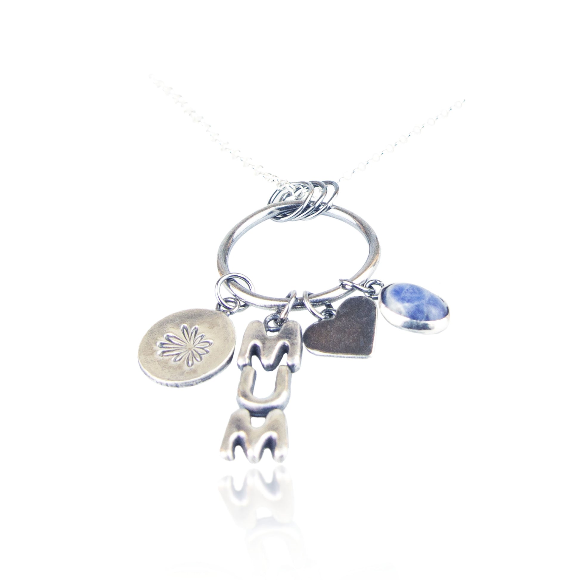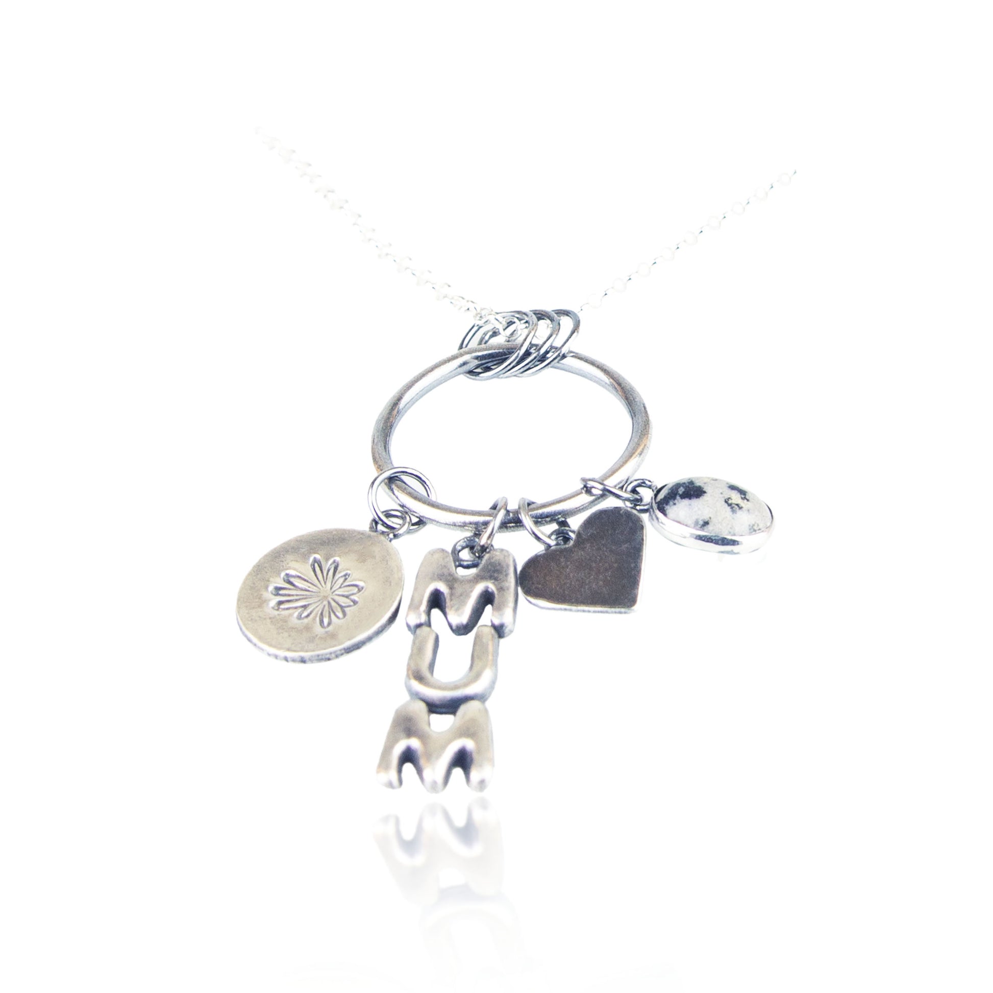 Celebrate the love of Mum with this beautifully handcrafted Silver Mum Charm Pendant. Featuring four delightful charms—'mum', a natural gemstone, a sweet heart, and a stamped flower—each element dangles gently from a round silver hoop. Entirely handmade with care, this pendant is a thoughtful keepsake and a perfect gift for the special mum in your life. A charming piece filled with meaning and love.