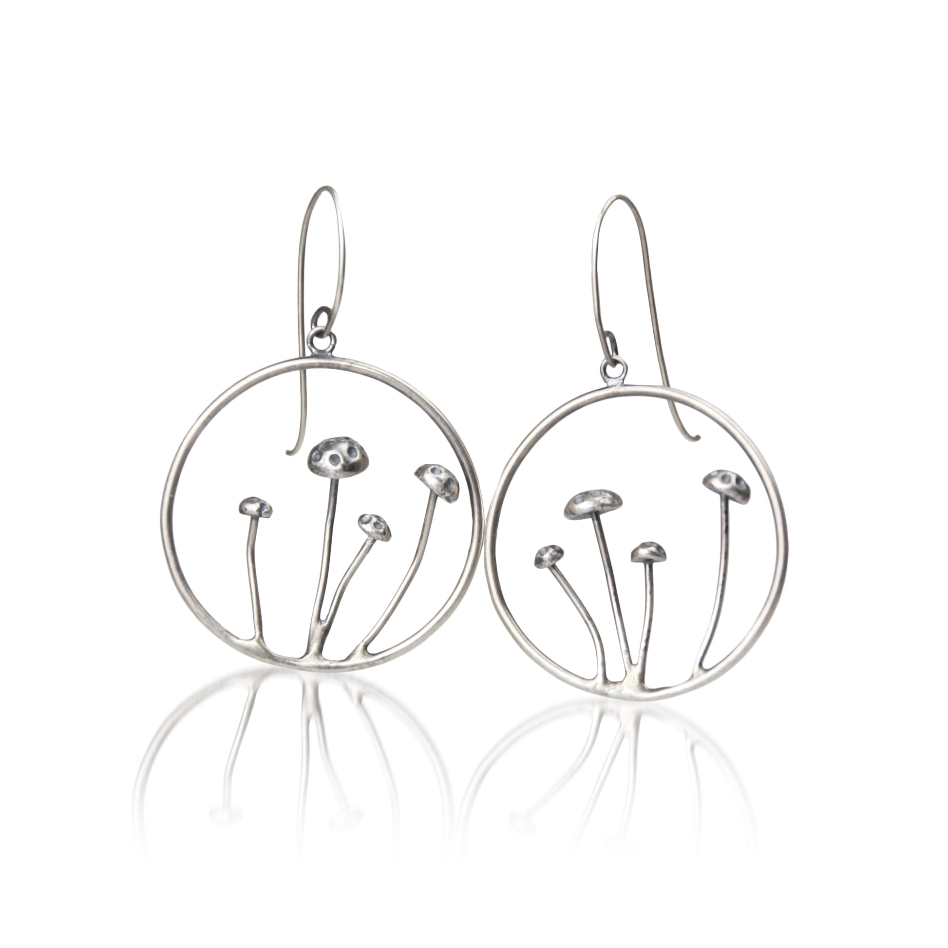 The mushroom motif, set against a 925 Sterling silver round backdrop, brings a touch of woodland magic to your ears. The dark patina finish adds depth and contrast to the design. This antiqued effect not only enhances the mushroom motif but also brings an old-world charm, making each piece a timeless treasure.