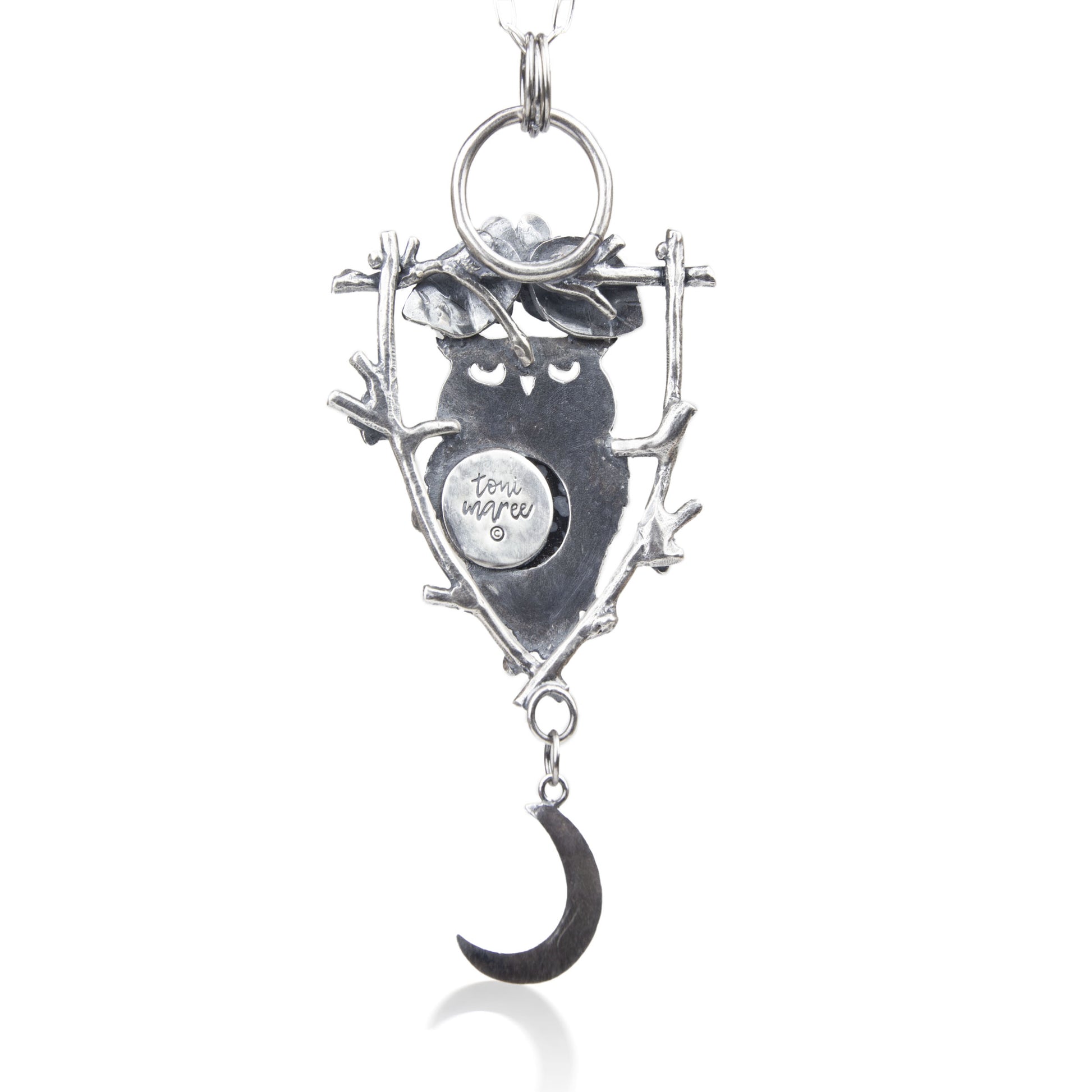 Celebrate the beauty of nature and the night with my Silver Owl & Moon Pendant, handcrafted from responsibly sourced 925 Sterling Silver and 999 Fine Silver components. This enchanting piece features a hand-cut owl perched on handmade silver branches, accented by a delicate floral design at the top and a dangling moon below. At the centre is a striking natural Snowflake Obsidian gemstone, adding a mystical touch to the pendant. Finished with a glossy texture, this unique design brings together the elegance of fine craftsmanship and the magic of the night sky.