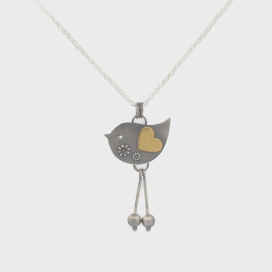 A joyful, whimsical treasure to brighten your day. This adorable pendant features a handmade silver bird with a sweet brass heart-shaped wing and tiny silver legs that swing as you move. Crafted entirely by hand using traditional metalsmithing techniques in my eco-friendly Brisbane studio. Made from recycled silver and responsibly sourced materials, this piece reflects my commitment to sustainability and ethical craftsmanship. A delightful addition to any jewellery collection or a perfect gift for someone special.